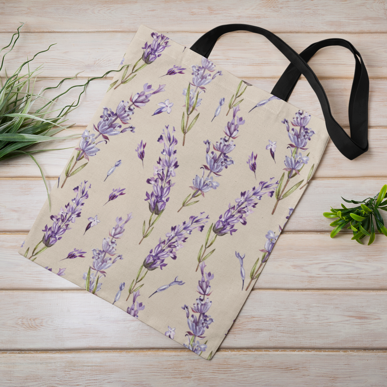 | Uz maisiņa: | attēls: Birstošie lavandu ziedi uz bēša fona |