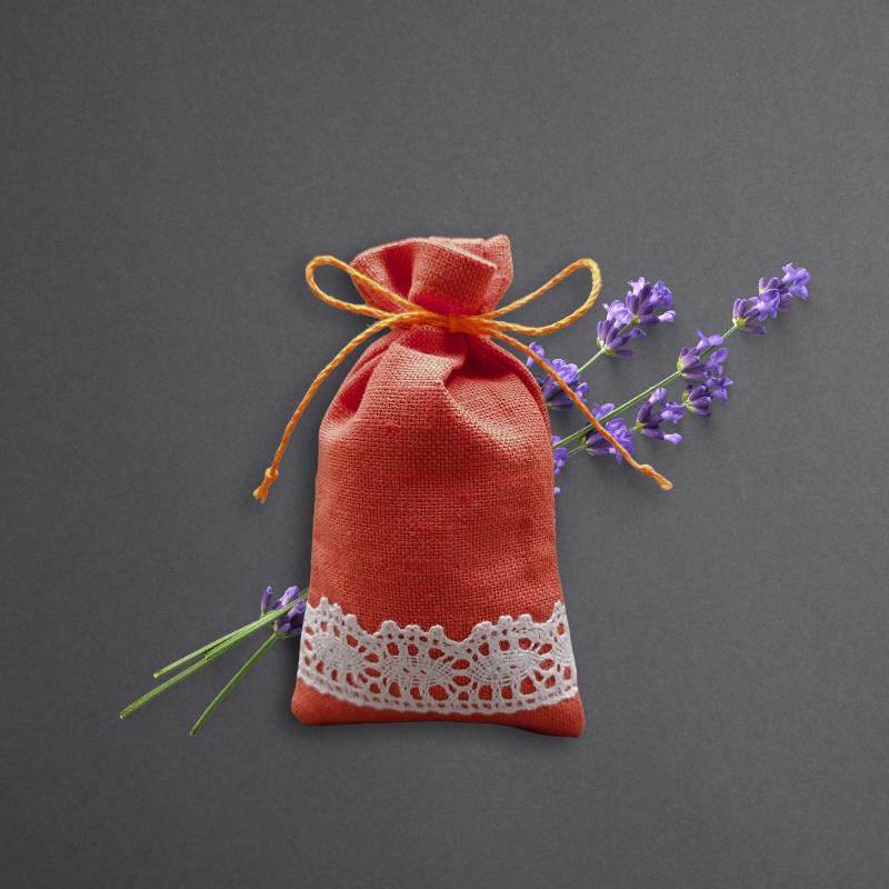 Lavandas ziedi lina maisiņā – 20 g (lielais) | oranžais ar mežģīni