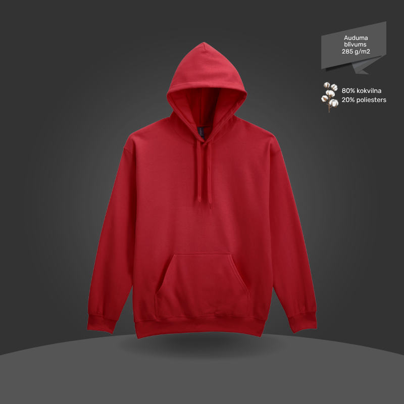 Izgatavots no kvalitatīva kokvilnas un poliestera maisījuma, ar mīkstu iekšpusi papildu komfortam un izturīgu formu arī pēc mazgāšanas. Klasisks unisex piegriezums ar priekšējo kabatu un regulējamu kapuci, pieejams dažādās krāsās un piemērots arī apdrukai.