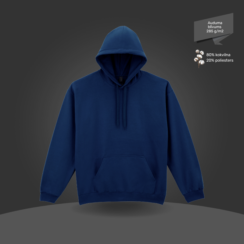 Izgatavots no kvalitatīva kokvilnas un poliestera maisījuma, ar mīkstu iekšpusi papildu komfortam un izturīgu formu arī pēc mazgāšanas. Klasisks unisex piegriezums ar priekšējo kabatu un regulējamu kapuci, pieejams dažādās krāsās un piemērots arī apdrukai.