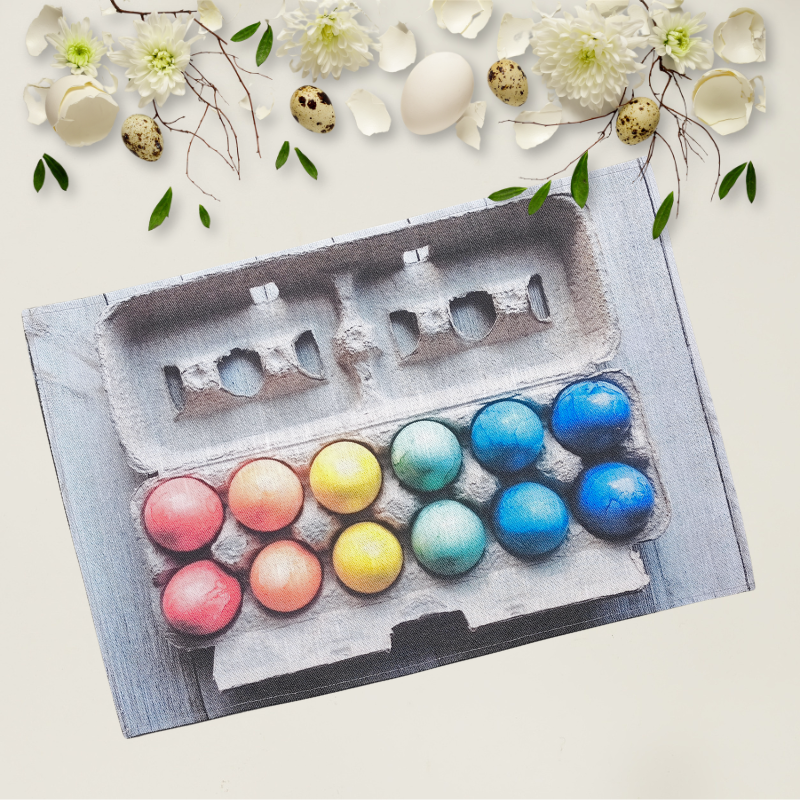 Reālistisks un mūsdienīgs dizains lina dvielim, kas atspoguļo pašu svētku gatavošanās procesu – krāsainas olas kartona kastītē. Šis fotoreālistiskais apdrukas stils piešķir virtuvei industriālu vai modernu rustikālo šarmu. Lieliska dāvana tiem, kuri augstu vērtē Lieldienu tradīcijas un ģimenisku kopābūšanu.